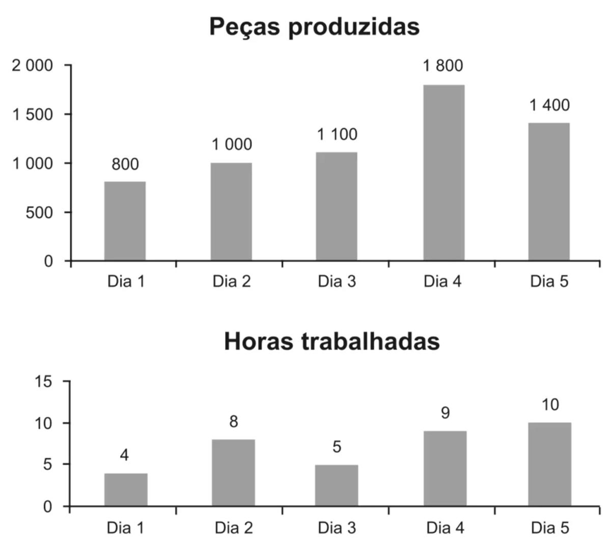 Os gráficos representam a produção de peças em uma indústria e as horas trabalhadas dos funcionários no período de cinco dias. Em cada dia, o gerente de produção aplica uma metodologia diferente de trabalho. Seu objetivo é avaliar a metodologia mais eficiente para utilizá-la como modelo nos próximos períodos. Sabe-se que, neste caso, quanto maior for a razão entre o número de peças produzidas e o número de horas trabalhadas, maior será a eficiência da metodologia.