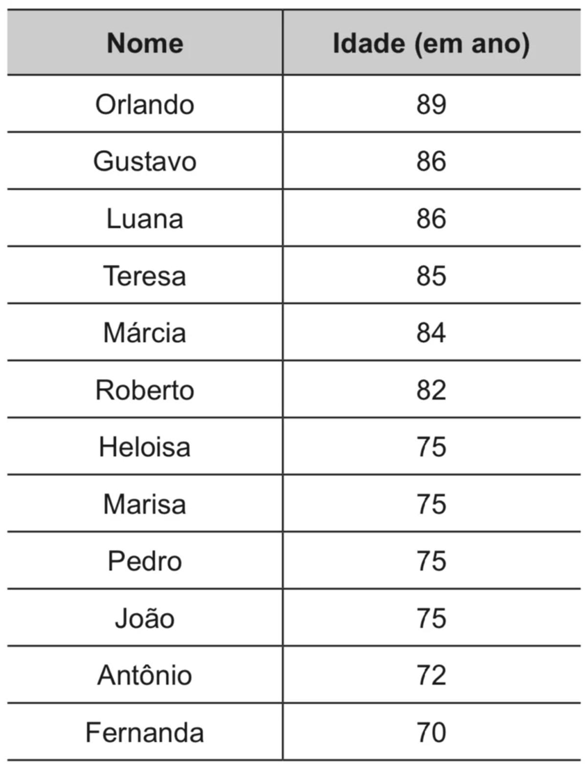 O Estatuto do Idoso, no Brasil, prevê certos direitos às pessoas com idade avançada, concedendo a estas, entre outros benefícios, a restituição de imposto de renda antes dos demais contribuintes. A tabela informa os nomes e as idades de 12 idosos que aguardam suas restituições de imposto de renda. Considere que, entre os idosos, a restituição seja concedida em ordem decrescente de idade e que, em subgrupos de pessoas com a mesma idade, a ordem seja decidida por sorteio.
