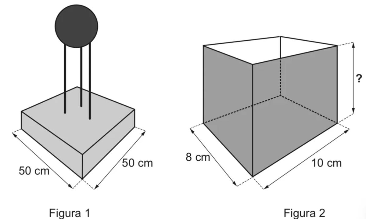 Um clube deseja produzir miniaturas em escala do troféu que ganhou no último campeonato. O troféu está representado na Figura 1 e é composto por uma base em formato de um paralelepípedo reto-retângulo de madeira, sobre a qual estão fixadas três hastes verticais que sustentam uma esfera de 30 cm de diâmetro, que fica centralizada sobre a base de madeira. O troféu tem 100 cm de altura, incluída sua base.