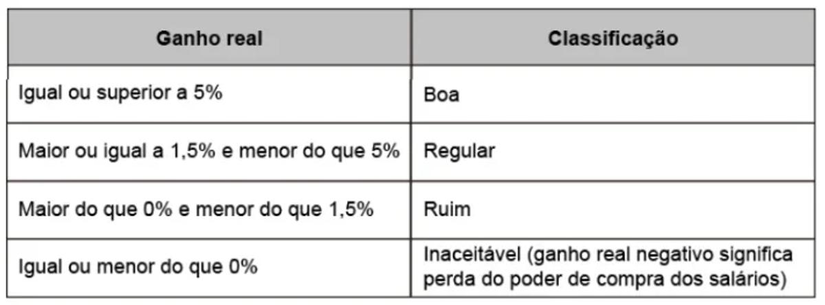 Considere que uma categoria de trabalhadores recebeu uma proposta de aumento salarial de 10%, e que a taxa de inflação do período correspondente tenha sido 5%. Para avaliar a proposta, os trabalhadores criaram uma classificação em função dos ganhos reais conforme o quadro.