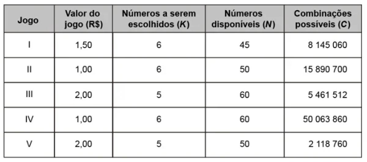 Uma casa lotérica oferece cinco opções de jogos. Em cada opção, o apostador escolhe um grupo de K números distintos em um cartão que contém um total de N números disponíveis, gerando, dessa forma, um total de C combinações possíveis para se fazer a marcação do cartão. Ganha o prêmio o cartão que apresentar os K números sorteados. Os valores desses jogos variam de R$ 1,00 a R$ 2,00, conforme descrito no quadro.