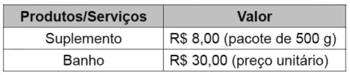 Segundo indicação de um veterinário, um cão de pequeno porte, nos dois primeiros meses de vida, deverá ser alimentado diariamente com 50 g de suplemento e tomar banho quatro vezes por mês. O dono de um cão de pequeno porte, seguindo orientações desse veterinário, utilizou no primeiro mês os produtos/serviços de um determinado pet shop, em que os preços estão apresentados no quadro.