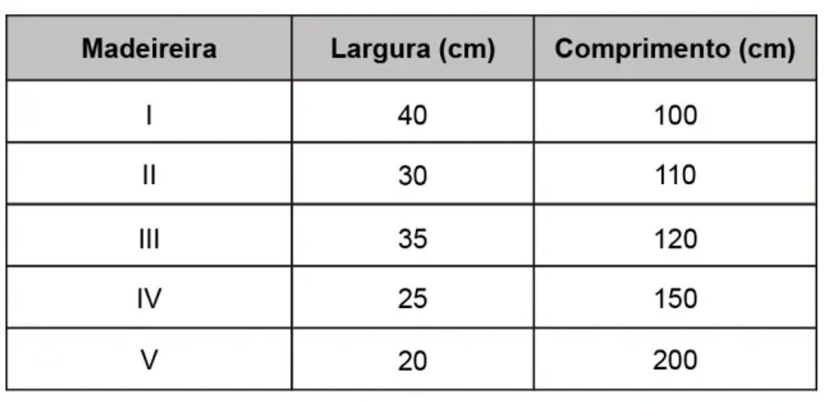 Um marceneiro visitou 5 madeireiras para comprar tábuas que lhe permitissem construir 5 prateleiras de formato retangular, de dimensões iguais a 30 cm de largura por 120 cm de comprimento cada, tendo como objetivo minimizar a sobra de madeira, podendo, para isso, fazer qualquer tipo de emenda. As dimensões das tábuas encontradas nas madeireiras estão descritas no quadro.