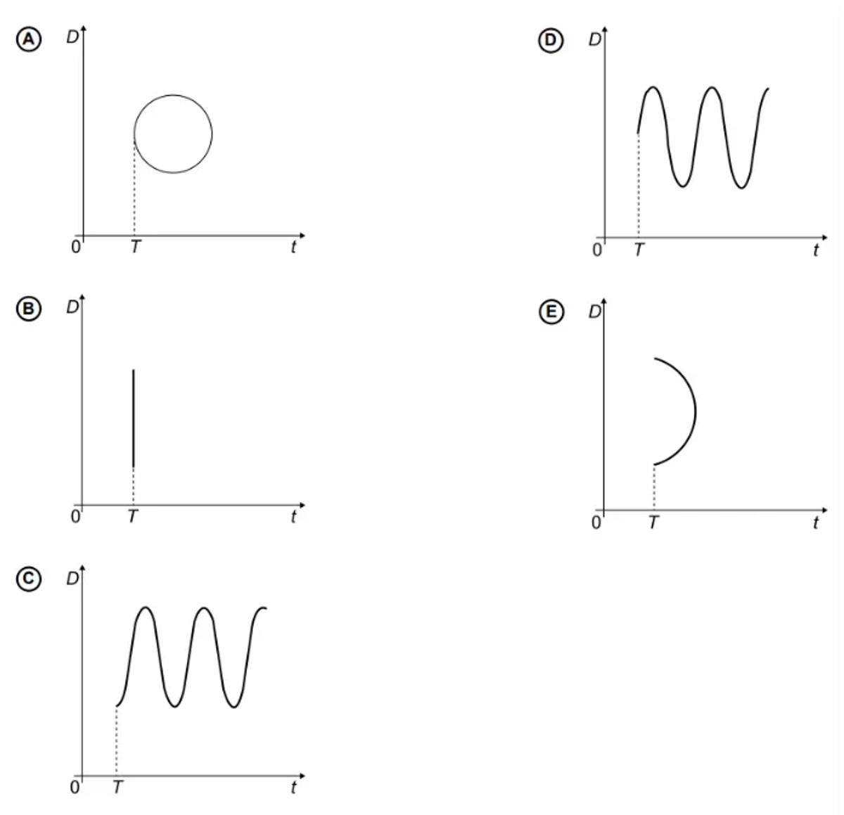 O gráfico que melhor representa, em função do tempo t a partir do instante T, a distância D é