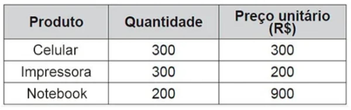 A gerência de uma loja de eletrônicos organizou em um quadro os dados de venda (quantidade e preço unitário) de celulares, impressoras e notebooks de um ano.