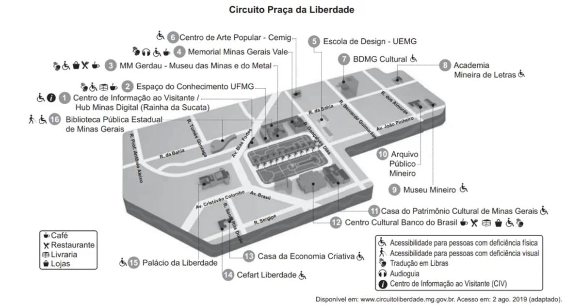 Partindo a pé do Museu Mineiro pelo trajeto mais curto até a próxima atração com tradução em Libras, serviço de alimentação e venda de livros, o leitor do mapa passará em frente ao(à):