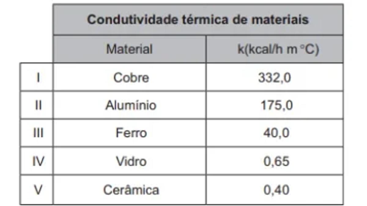 Alguns recipientes de cozinha apresentam condutividade térmica apropriada para acondicionar e servir alimentos. Assim, os alimentos acondicionados podem manter a temperatura, após o preparo, por um tempo maior. O quadro contém a condutividade térmica (k) de diferentes materiais utilizados na produção desses recipientes.