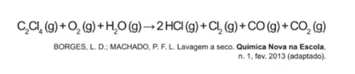 Os vapores desse solvente, quando expostos à elevada temperatura na presença de oxigênio e água, sofrem degradação produzindo gases poluentes, conforme representado pela equação: