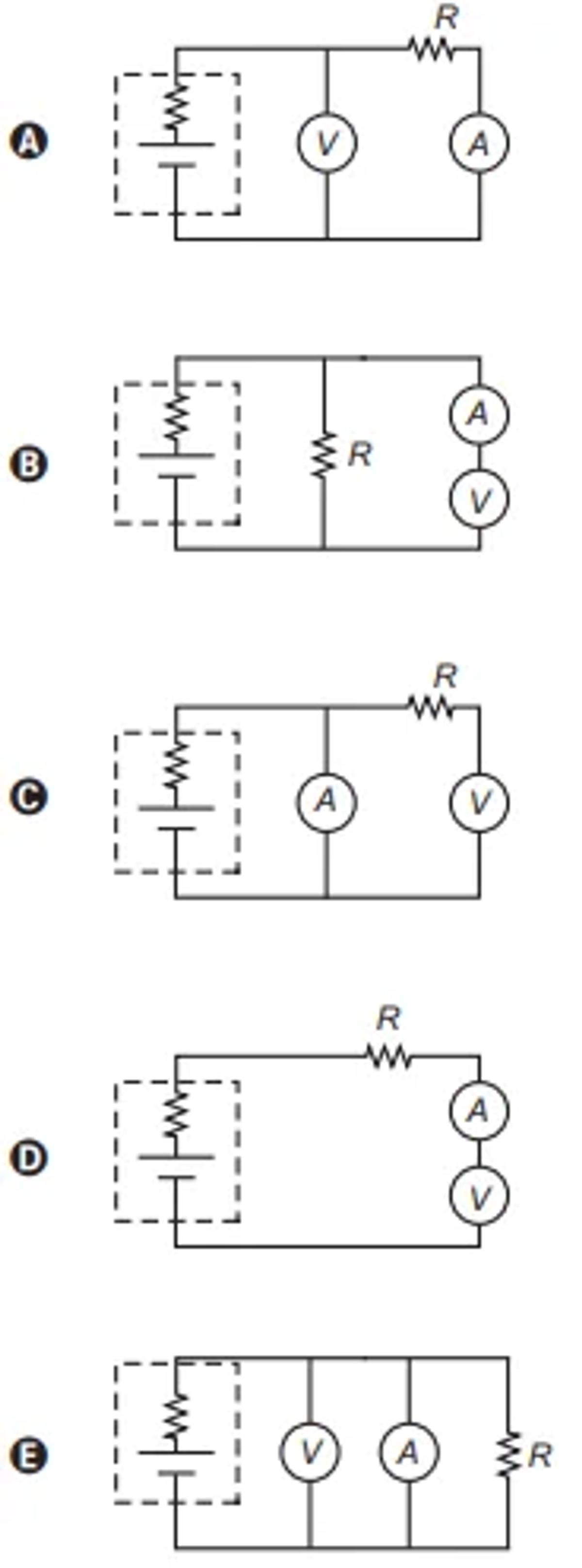De posse de um voltímetro , de um amperímetro e de uma resistência-teste R, a configuração adequada para avaliar a carga da bateria é: