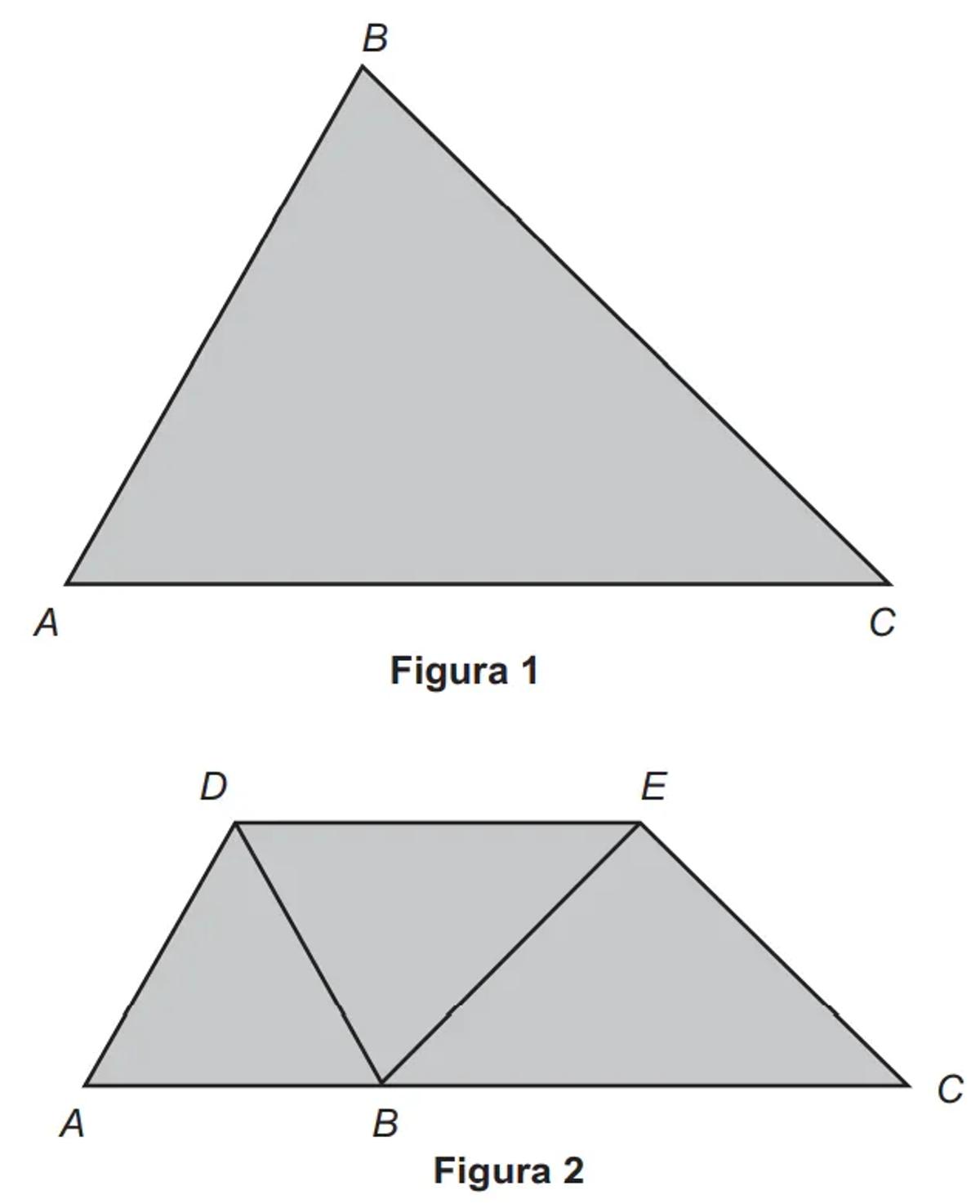 Posteriormente, a peça triangular ABC foi dobrada, de tal maneira que o vértice B ficou sobre o segmento AC, e o segmento DE ficou paralelo ao lado AC, conforme figura 2.