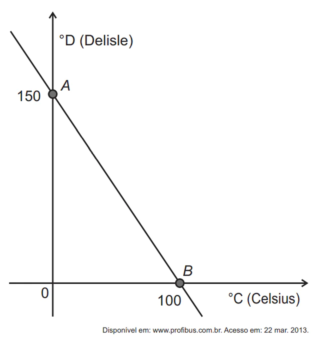 A escala de temperatura Delisle (°D), inventada no século XVIII pelo astrônomo francês Joseph-Nicholas Delisle, a partir da construção de um termômetro, foi utilizada na Rússia no século XIX. A relação entre as temperaturas na escala Celsius (°C) e na escala Delisle está representada no gráfico pela reta que passa pelos pontos A e B.