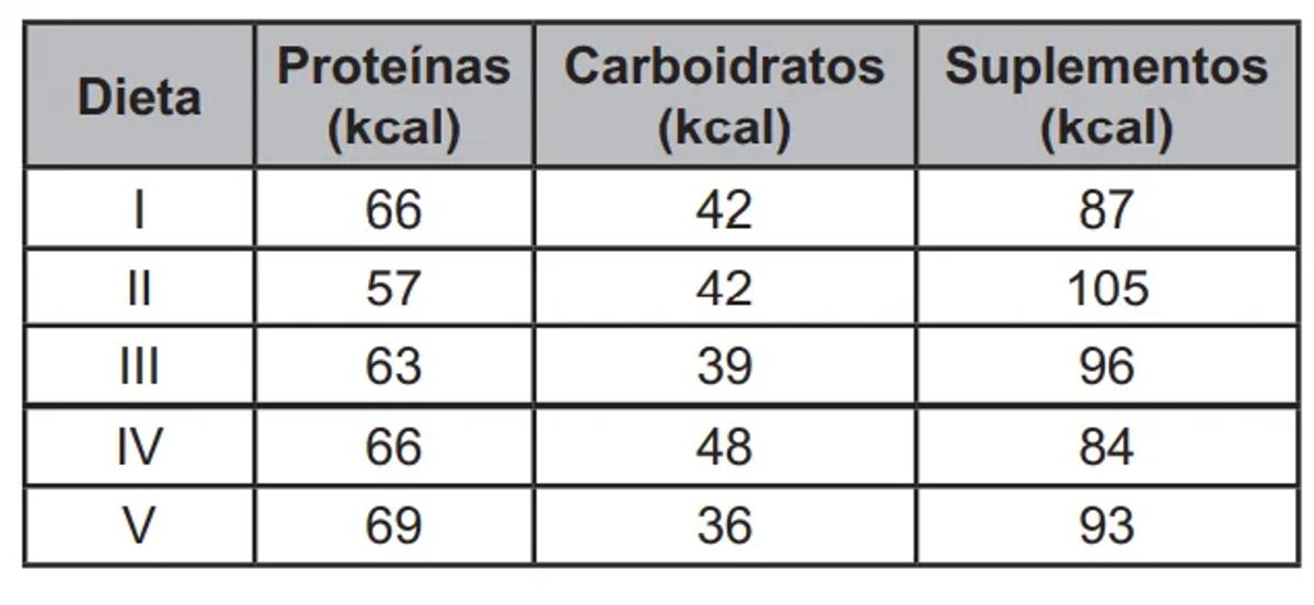 Um nutricionista preparou cinco opções de dieta para seus clientes. A quantidade de calorias, em quilocaloria, de cada dieta é apresentada no quadro, em função de três componentes básicos: proteínas, carboidratos e suplementos.