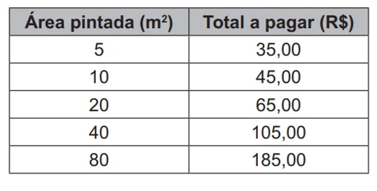 O preço médio cobrado por um pintor para executar um serviço consiste em uma taxa fixa de R$ 25,00 mais uma quantia proporcional à área pintada. O quadro apresenta os valores cobrados por ele em trabalhos recentes.