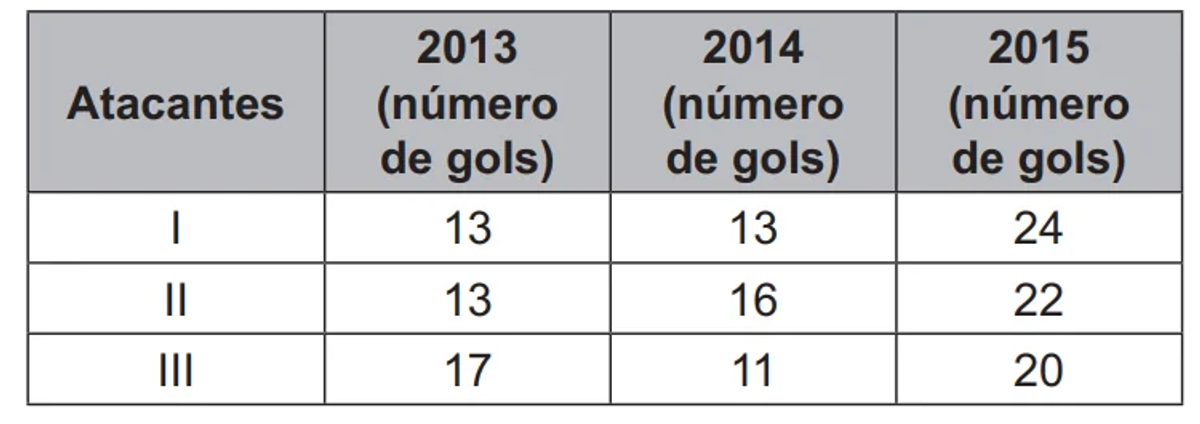 O primeiro quadro contém o número de gols marcados por três candidatos a atacantes, nas três temporadas anteriores.