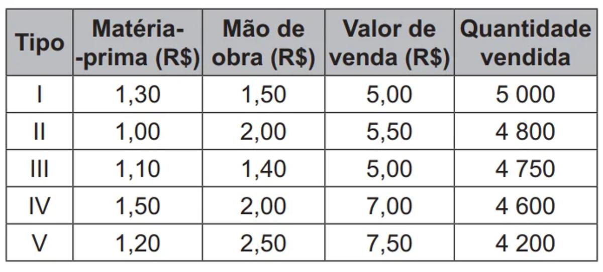 Um fabricante produz cinco tipos de enfeites de Natal. Para saber o lucro líquido correspondente a cada tipo de enfeite, criou um quadro com os valores de custo (matéria-prima e mão de obra) e de venda por unidade, em real, além da quantidade vendida para cada tipo de enfeite.