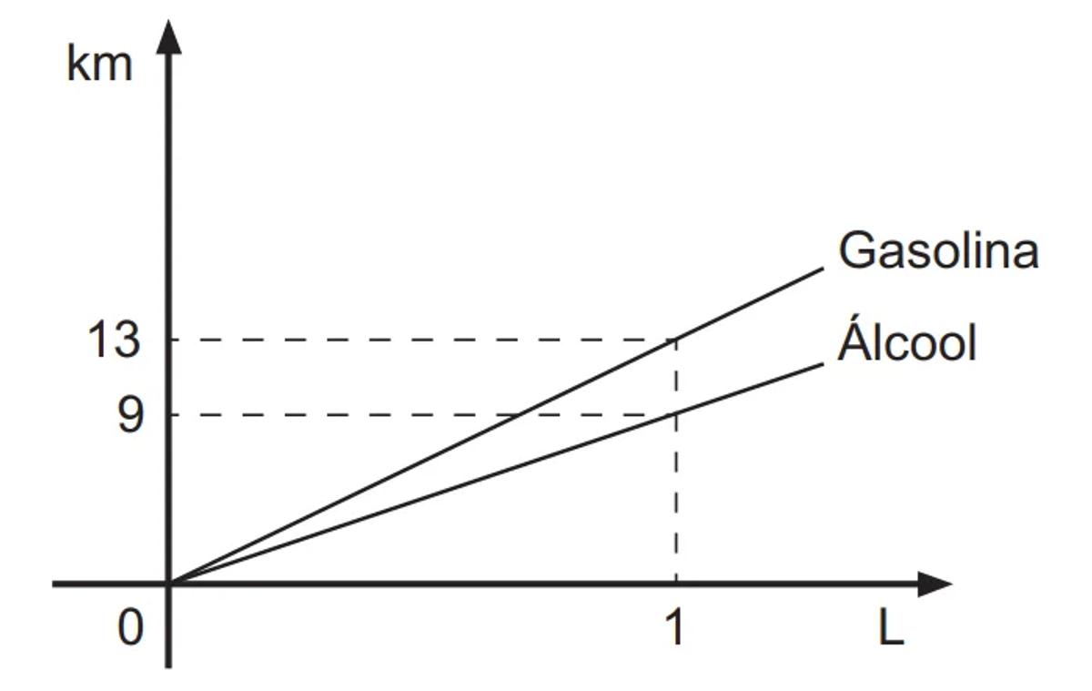 O rendimento de um carro bicombustível (abastecido com álcool ou gasolina), popularmente conhecido como carro flex, quando abastecido com álcool é menor do que quando abastecido com gasolina, conforme o gráfico, que apresenta o rendimento médio dos carros populares.