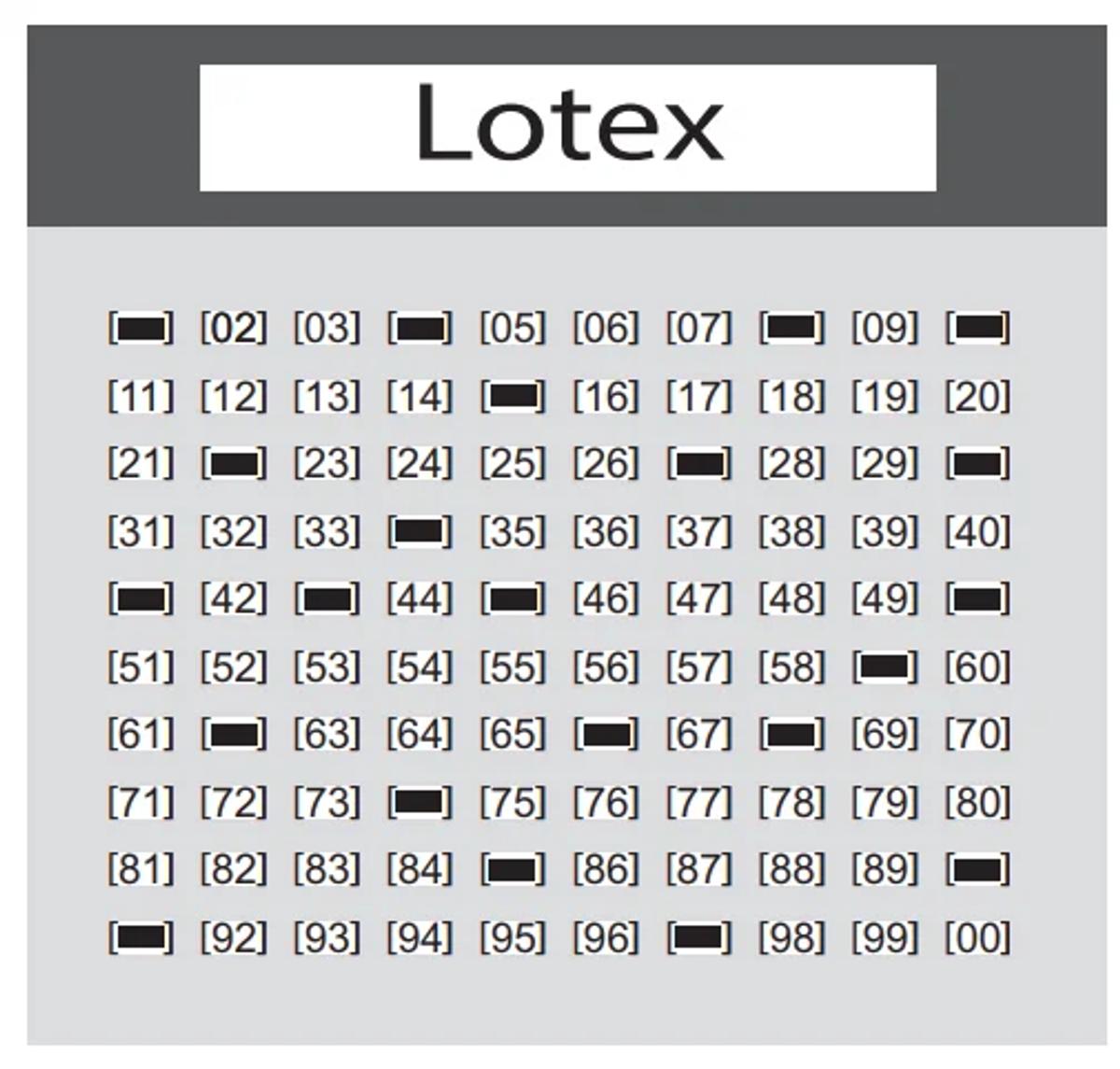 Na loteria Lotex, cada aposta corresponde à marcação de cinquenta números em um cartão. Caso o apostador marque uma quantidade inferior a cinquenta números, o sistema completará aleatoriamente a sua aposta até integralizar os cinquenta números necessários. Por exemplo, o cartão de aposta retratado representa as escolhas de um jogador antes que o sistema integralize o seu preenchimento.