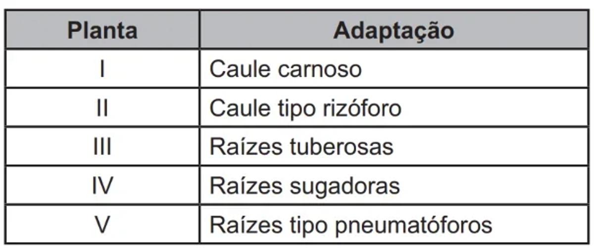 Ao longo do processo evolutivo, adaptações anatômicas e fisiológicas permitiram a sobrevivência de plantas às condições dos diferentes ambientes habitados. O quadro apresenta exemplos de cinco plantas com diferentes características.