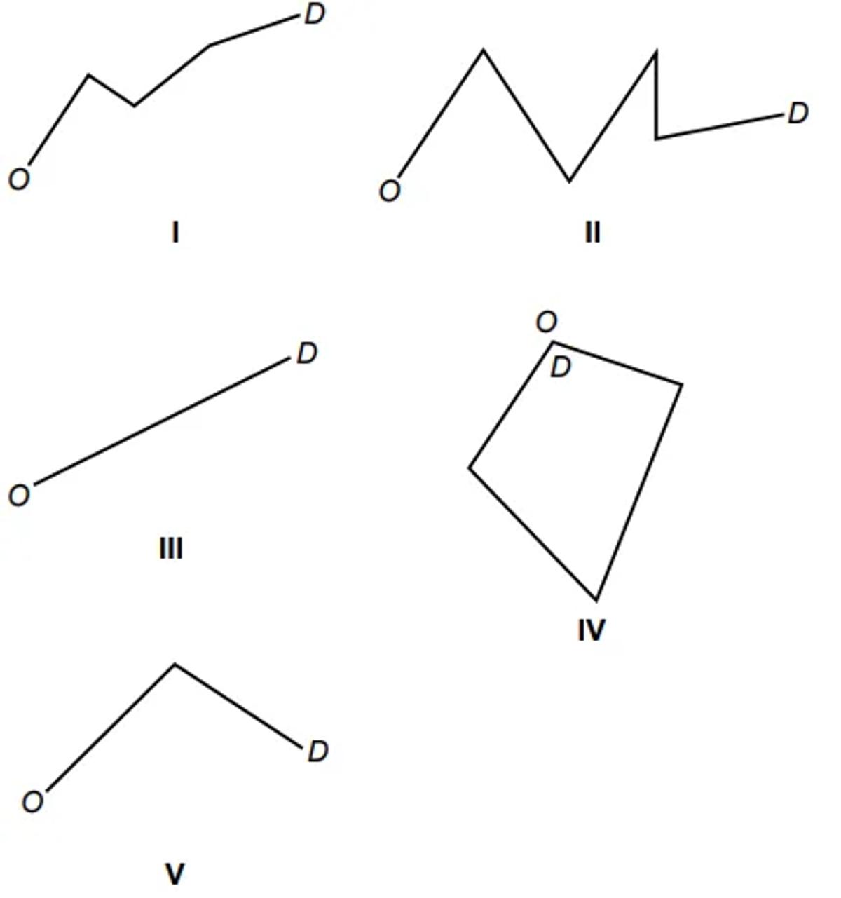 A trajetória de um avião durante um voo entre duas cidades ocorre dentro de áreas de controle de tráfego. Durante um voo, é exigido que o avião sobrevoe pontos de controle situados no solo e demarcados entre a origem (O) e o destino (D) da aeronave. Assim, embora a trajetória do avião ocorra num espaço tridimensional, para o controlador de voo, a visualização representativa dessa trajetória é dada por uma linha poligonal plana, em que três pontos de controle sucessivos, nas representações, devem ser não colineares. Disponível em: www.kaspersky.com.br. Acesso em: 21 out. 2019 (adaptado).
