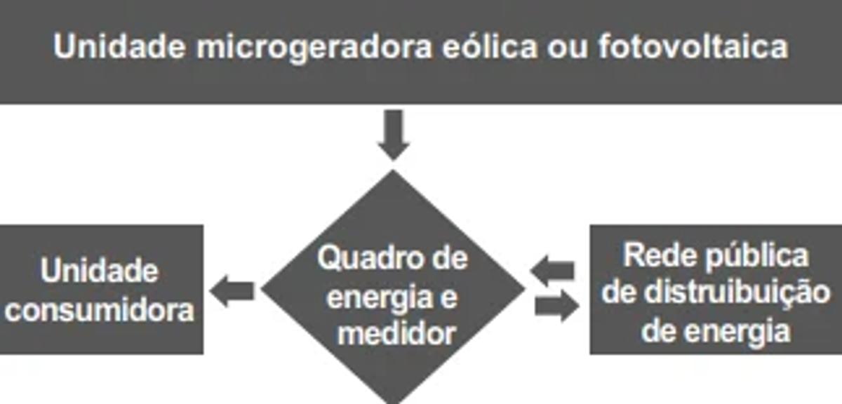 A crescente facilidade para aquisição de aerogeradores e painéis fotovoltaicos tem permitido que unidades consumidoras tenham suas próprias unidades microgeradoras de energia. A integração das unidades microgeradoras à rede pública de distribuição pode beneficiar tanto as unidades consumidoras quanto as concessionárias de fornecimento, conforme o fluxograma. Quando as unidades microgeradoras não geram energia suficiente para a unidade consumidora, a rede de distribuição supre a diferença. Quando a unidade microgeradora gera excedente de energia, esse excedente poderá ser entregue à concessionária em troca de crédito.