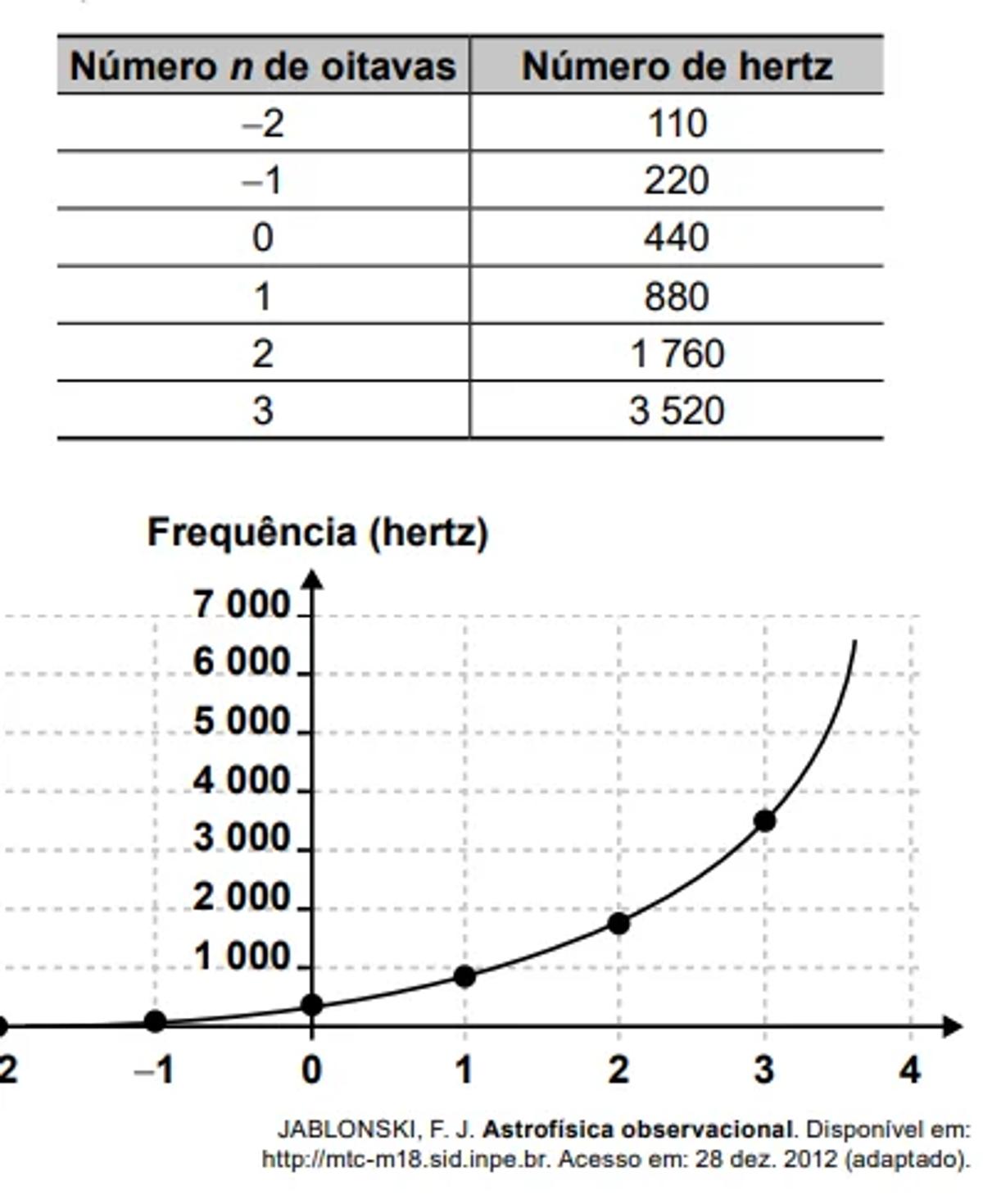A altura de uma nota musical é determinada pela frequência da vibração que a nota causa. No piano, considere como referência a nota Lá, cuja frequência é 440 hertz, e a existência de outras notas Lá com frequências acima e abaixo desta. A tabela a seguir mostra as frequências de algumas notas Lá, em função do número n de oitavas abaixo e acima do Lá de referência, e o gráfico corresponde a uma função contínua que passa pelos pontos dados na tabela.