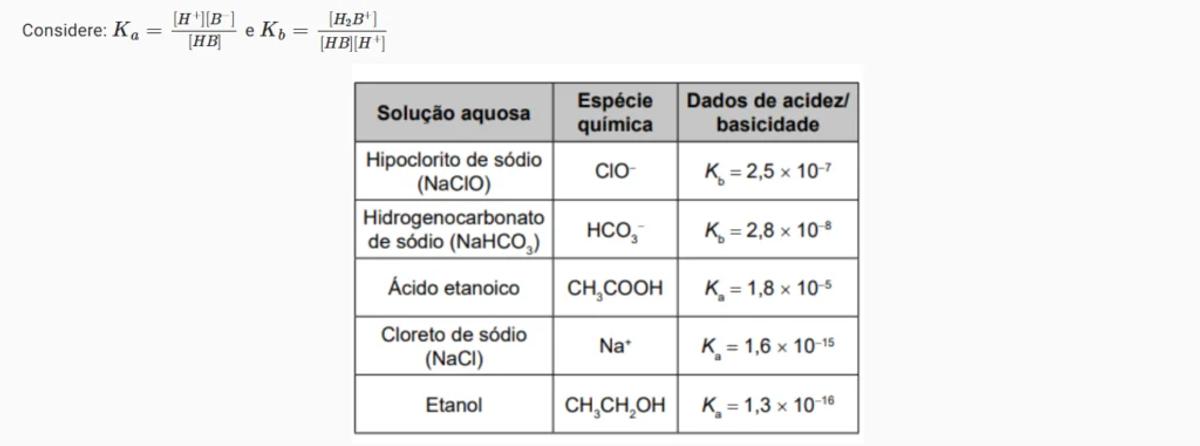 Suponha que a molécula responsável pelo odor é a metilamina (CH3NH2, Kb=5,5×10^−4). O quadro apresenta dados de acidez/basicidade de algumas espécies químicas.
