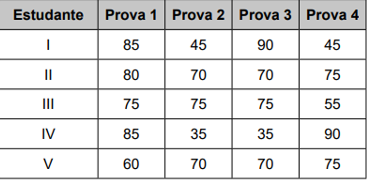 Cinco estudantes dessa disciplina obtiveram as notas apresentadas no quadro.