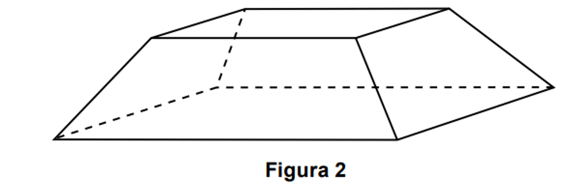 O modelo geométrico de um tachão está representado na Figura 2. Ele é formado por duas faces retangulares paralelas e quatro faces trapezoidais. Suas arestas laterais, se prolongadas, concorrem em um mesmo ponto.