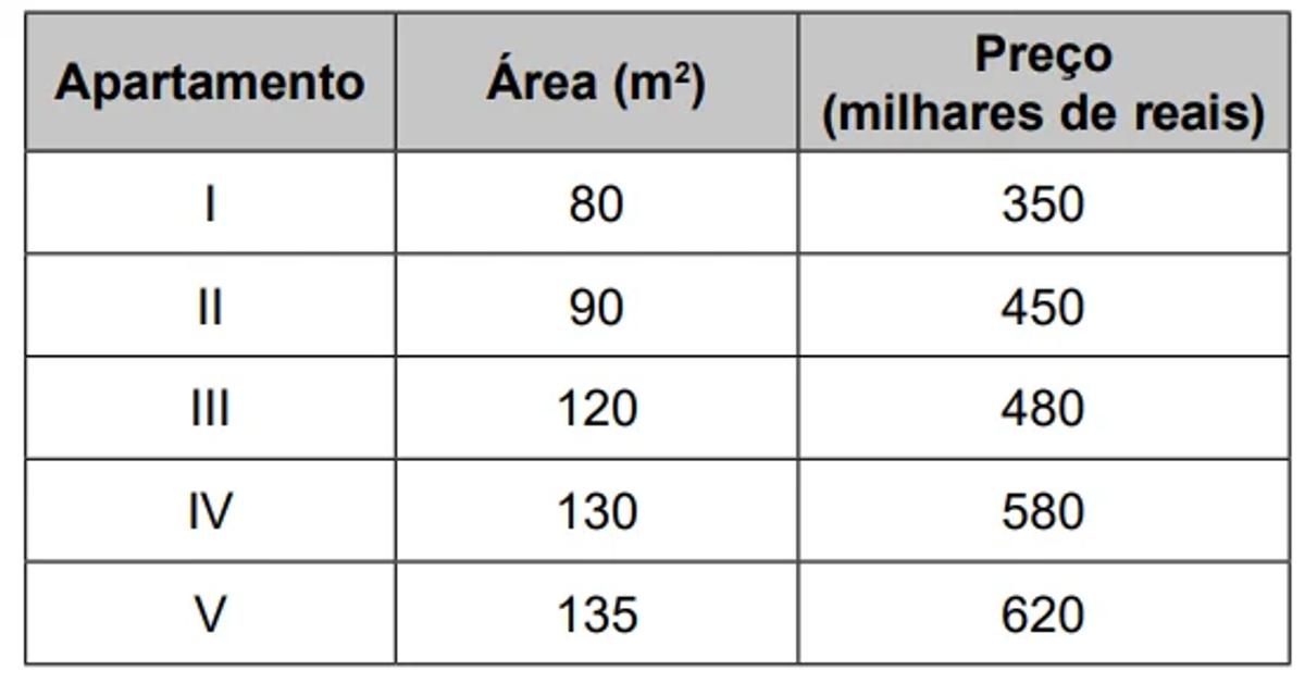 Uma imobiliária pôs cinco apartamentos à venda em cinco prédios diferentes de uma cidade brasileira. O quadro apresenta o preço e a área de cada um desses imóveis.
