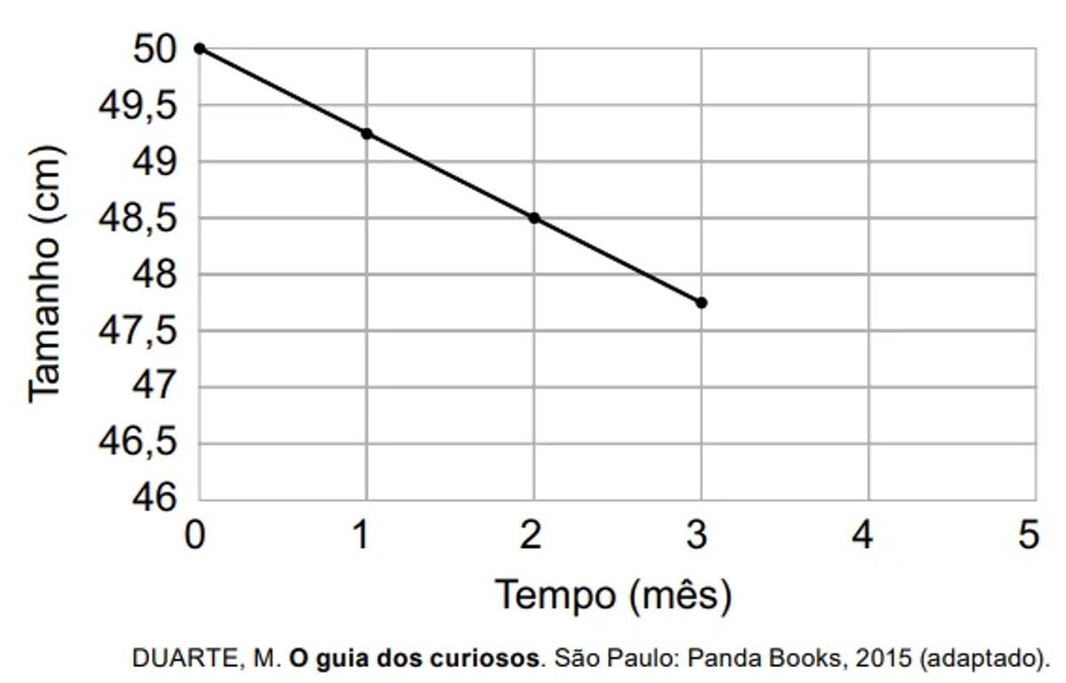 No espaço, a falta de gravidade faz com que o organismo produza mais cálcio e, como o mineral não é usado, o corpo o expele, fazendo com que os ossos diminuam de tamanho. Um dos ossos que sofrem essa redução é o fêmur. O gráfico apresenta a evolução linear do tamanho desse osso, ao longo de três meses, em um astronauta que, antes de ir para o espaço, tinha um fêmur de 50 cm.