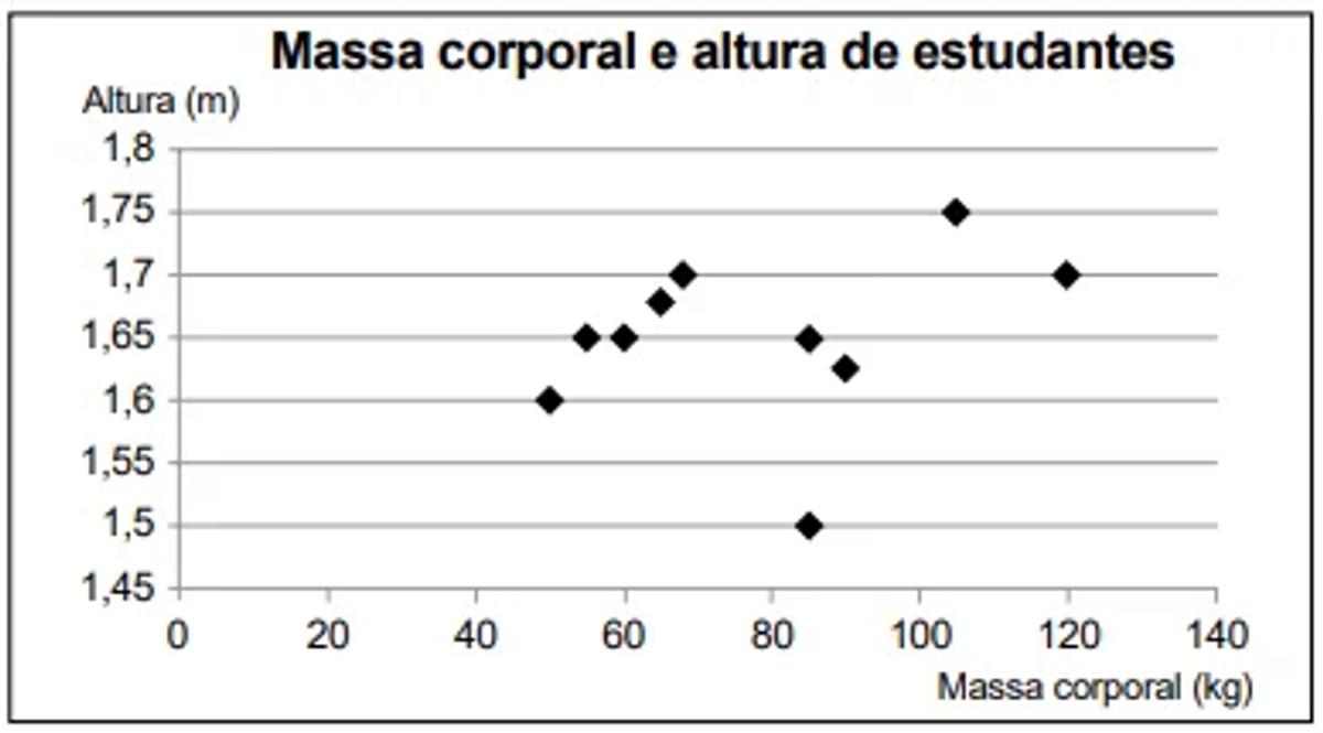 era verificar o percentual de estudantes com massa corporal abaixo da média e altura acima da média de um grupo de estudantes. Para isso, usando uma balança e uma fita métrica, avaliou uma amostra de dez estudantes, anotando as medidas observadas. O gráfico apresenta a massa corporal, em quilograma, e a altura, em metro, obtidas na atividade.