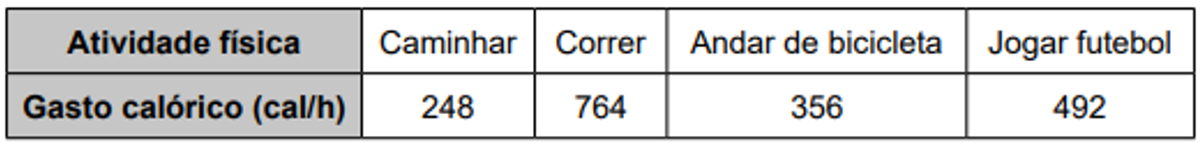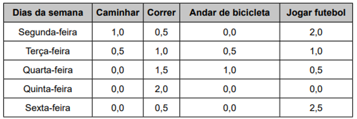 Uma pessoa pratica quatro atividades físicas — caminhar, correr, andar de bicicleta e jogar futebol — como parte de seu programa de emagrecimento. Essas atividades são praticadas semanalmente de acordo com o quadro, que apresenta o número de horas diárias por atividade.