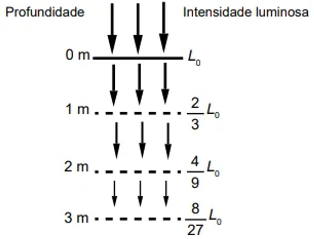Considere que a intensidade luminosa diminui, a cada metro acrescido na profundidade, segundo o mesmo padrão do esquema.