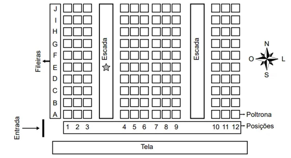 Nesse cinema, as poltronas são identificadas por uma letra, que indica a fileira, e um número, que fornece a posição da poltrona na fileira, respectivamente.