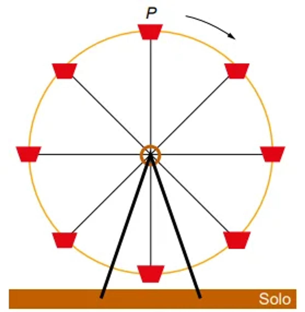 A figura ilustra uma roda-gigante no exato instante em que a cadeira onde se encontra a pessoa P está no ponto mais alto dessa roda-gigante.