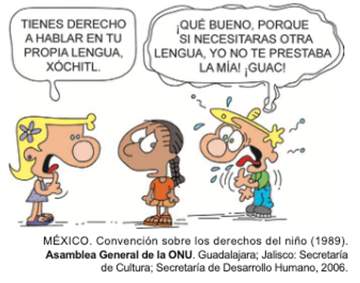 4.2 — Encontrar o direito específico recortado. O balão principal é claro: "TIENES DERECHO A HABLAR EN TU PROPIA LENGUA, XÓCHITL". É o direito de falar a própria língua.