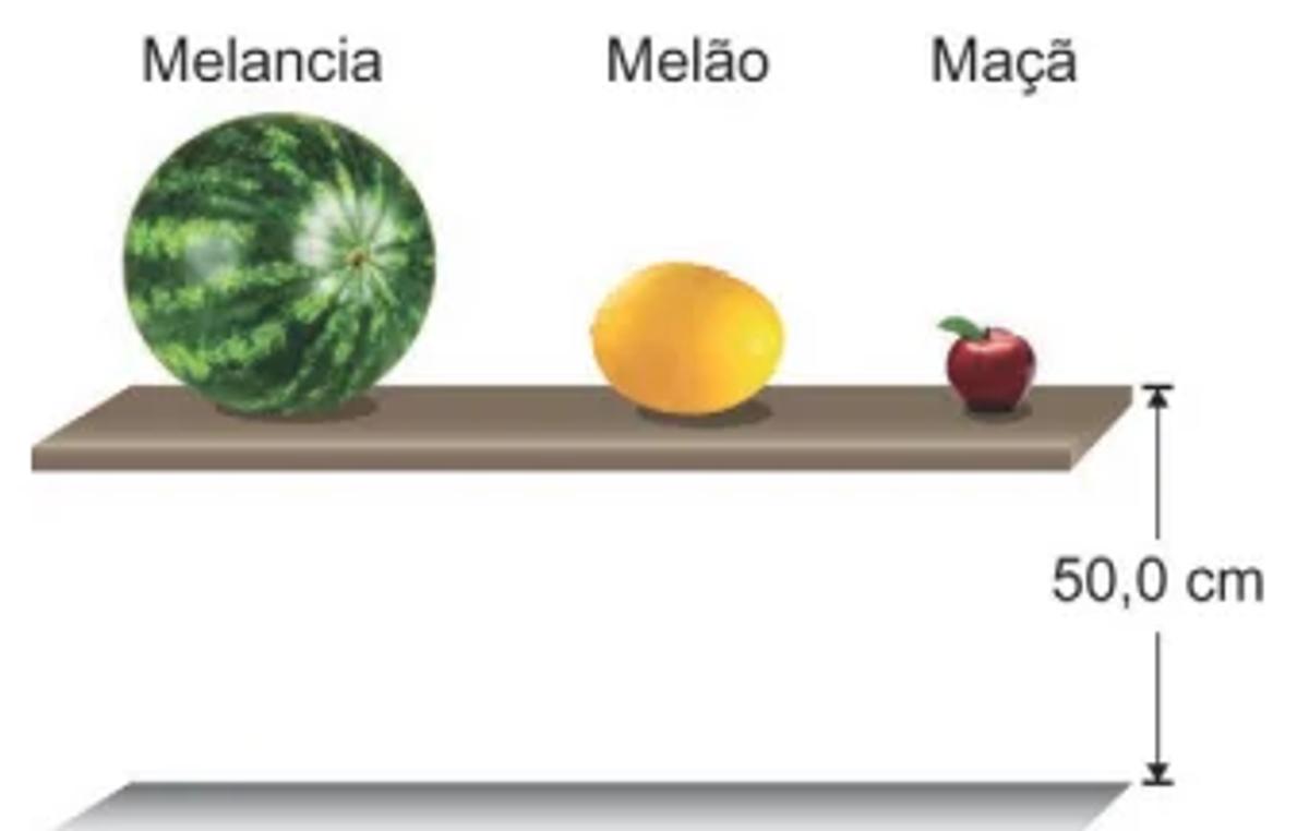 Um experimento foi montado com o intuito de determinar o tempo de queda livre de corpos com tamanhos e massas distintas. Para isso, utilizou-se uma prateleira a 50,0 cm do chão, onde foram colocadas três frutas, conforme a figura. Em um determinado instante, a prateleira foi removida, liberando todas as frutas simultaneamente.