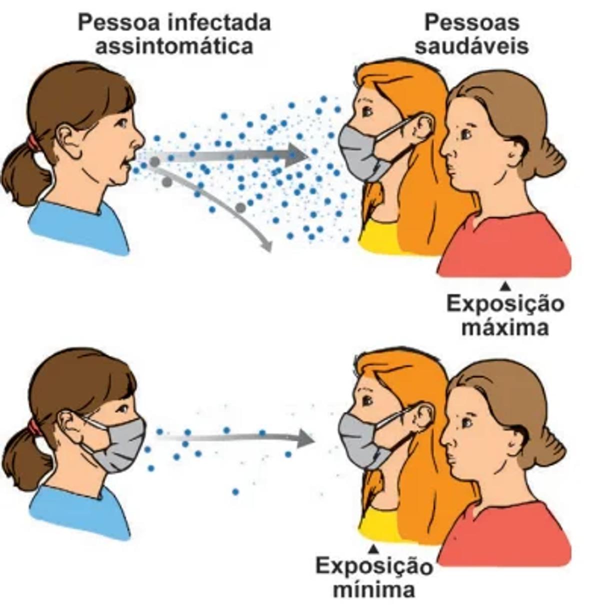 Ao respirarmos, falarmos, tossirmos ou espirrarmos, liberamos gotículas e aerossóis. Se estamos com alguma infecção respiratória viral, vírus estarão contidos ali. Estima-se que uma pessoa com covid-19 falando alto por 1 minuto pode gerar mais de 1000 partículas de aerossóis, o que poderia levar à liberação de mais de 100000 partículas virais de SARS-CoV-2. O uso de máscaras pela população pode auxiliar na redução da transmissão desse vírus, conforme representado na figura.