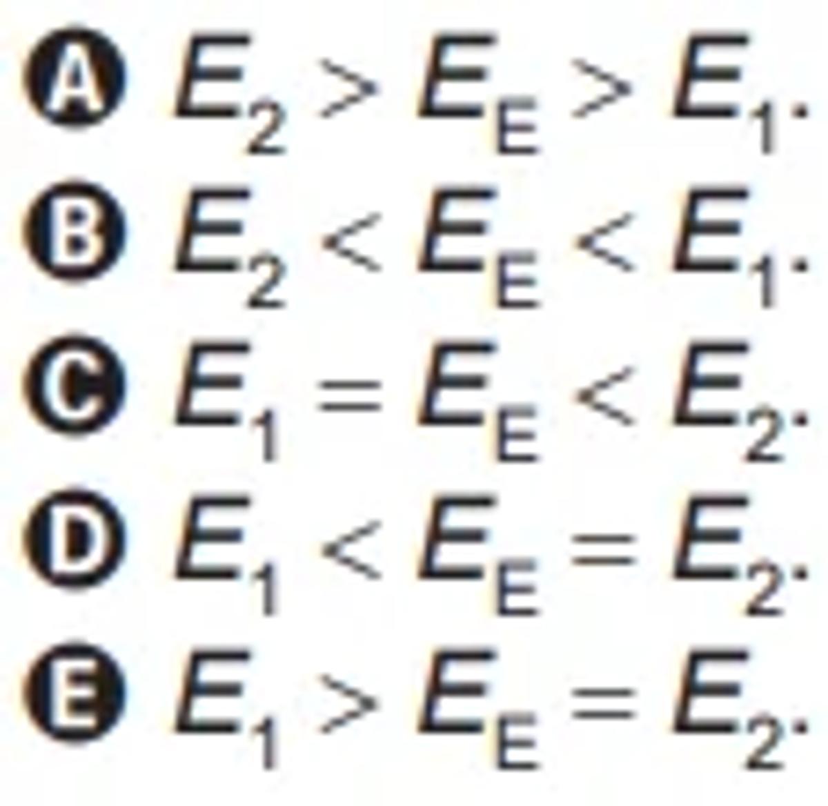 Identificando a órbita interna como R1, a órbita geoestacionária como R2 e a órbita elíptica como E, as energias mecânicas do satélite nas três órbitas são identificadas, respectivamente, como E1, E2 e EE.