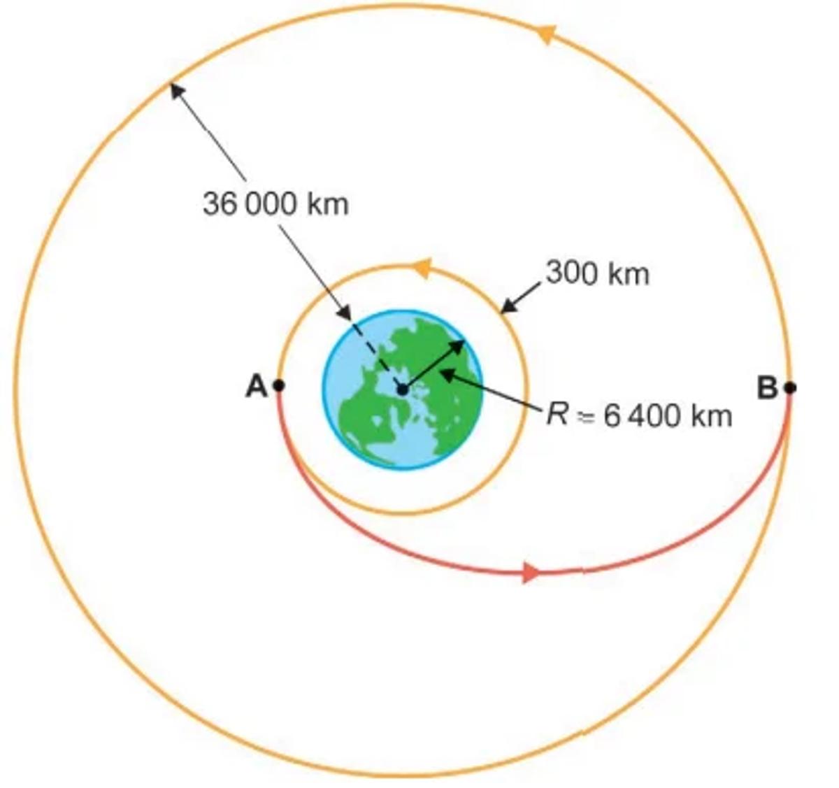 No estágio de propulsão, aplica-se um impulso tangencial à trajetória no ponto A, mudando-se para uma órbita elíptica até o satélite atingir o ponto B, que coincide com o raio de sua órbita geoestacionária.