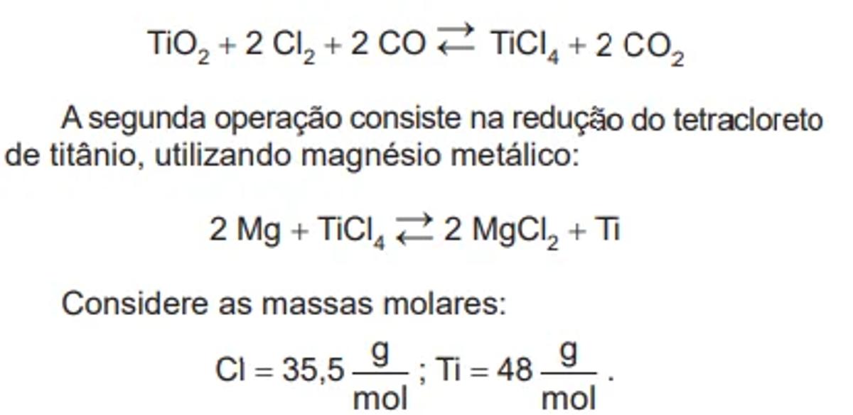 O titânio é encontrado na natureza em minerais, dos quais o rutilo (TiO2) está presente na principal mina do Brasil, localizada no Rio Grande do Norte. Para obtenção do titânio metálico, o TiO2 é submetido a duas operações industriais. A primeira consiste na cloração, produzindo tetracloreto de titânio, conforme a equação: