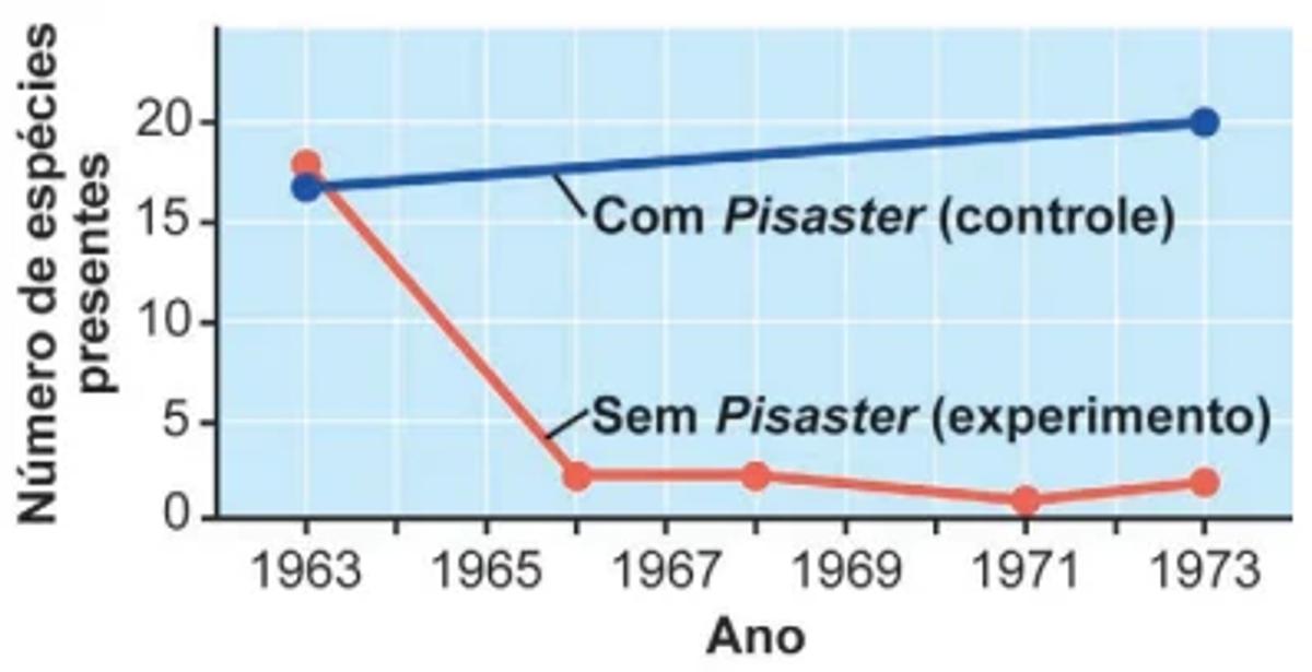 Pisaster ochraceus é uma espécie de estrela-do-mar que ocorre em comunidades da zona entremarés da América do Norte Ocidental. Seu principal alimento são moluscos da espécie Mytilus californianus. Esse molusco, por sua vez, é dominante e compete por espaço com muitos outros invertebrados e até algas. Pesquisadores estudam as relações ecológicas nesse ambiente desde a década de 1960, com o objetivo de entender a dinâmica dessas comunidades. Alguns dados são apresentados no gráfico