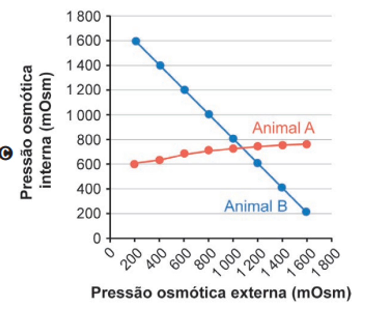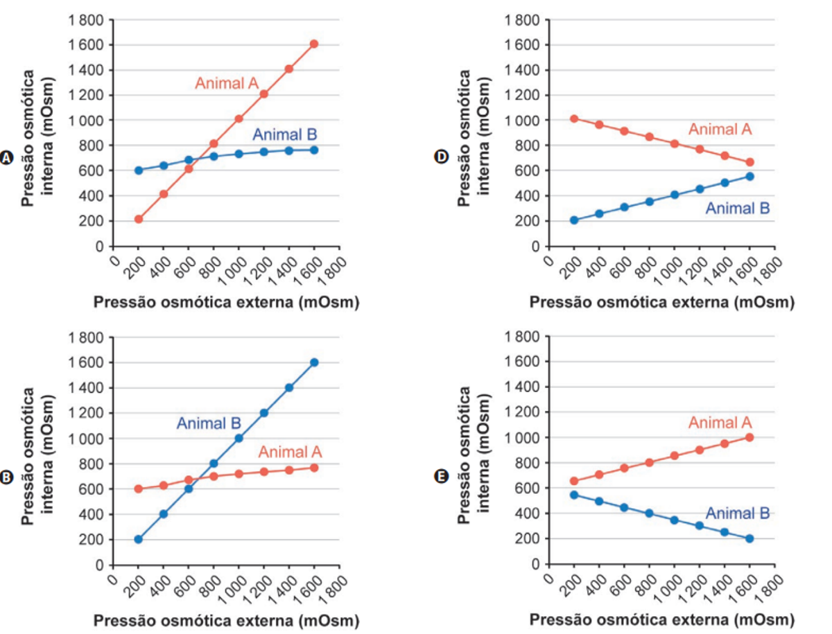 apresentam estratégias que permitem adaptações a essas variações. Animais que mantêm osmolaridade interna relativamente constante são chamados de osmorreguladores. Já os animais que não controlam ativamente a condição osmótica de seus líquidos corporais, adaptando-se à osmolaridade do ambiente, são chamados de osmoconformadores. Um pesquisador coletou animais de duas espécies de invertebrados, sendo o Animal A um osmorregulador e o Animal B, um osmoconformador. Ambos foram submetidos, em laboratório, a ambientes aquáticos com diferentes osmolaridades. Em cada situação, foi medida a pressão osmótica interna tanto do Animal A como do Animal B.