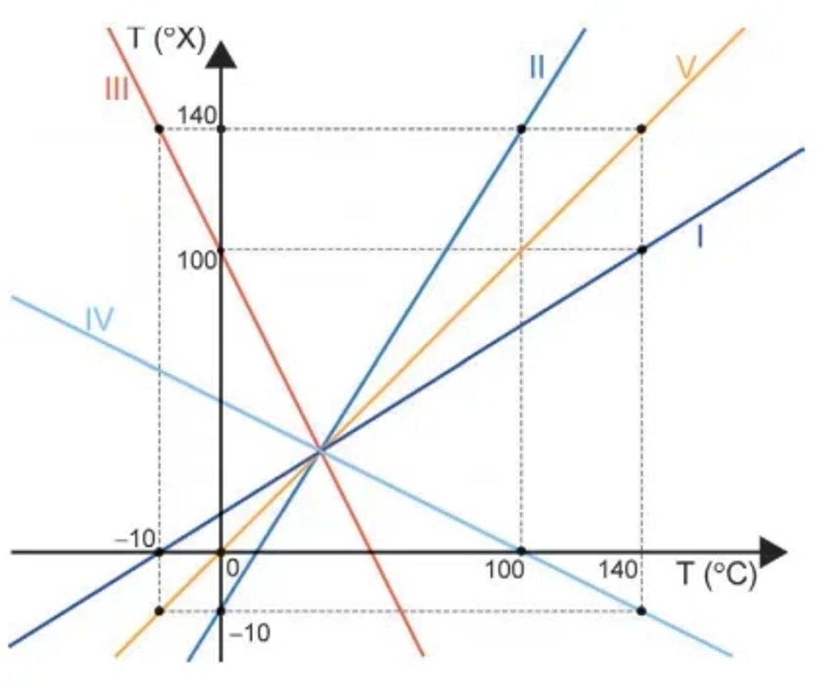 Uma escala termométrica X marca −10 °X para o ponto de fusão da água e 140 °X para o seu ponto de ebulição. Na escala Celsius, as temperaturas de fusão e de ebulição da água são 0 °C e 100 °C, respectivamente. O gráfico que expressa a relação entre essas duas escalas é uma reta.