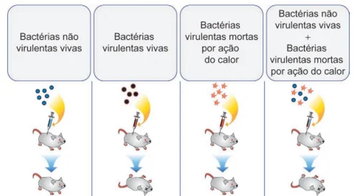 A figura ilustra diferentes etapas de um experimento realizado por Frederick Griffith em 1928 com camundongos