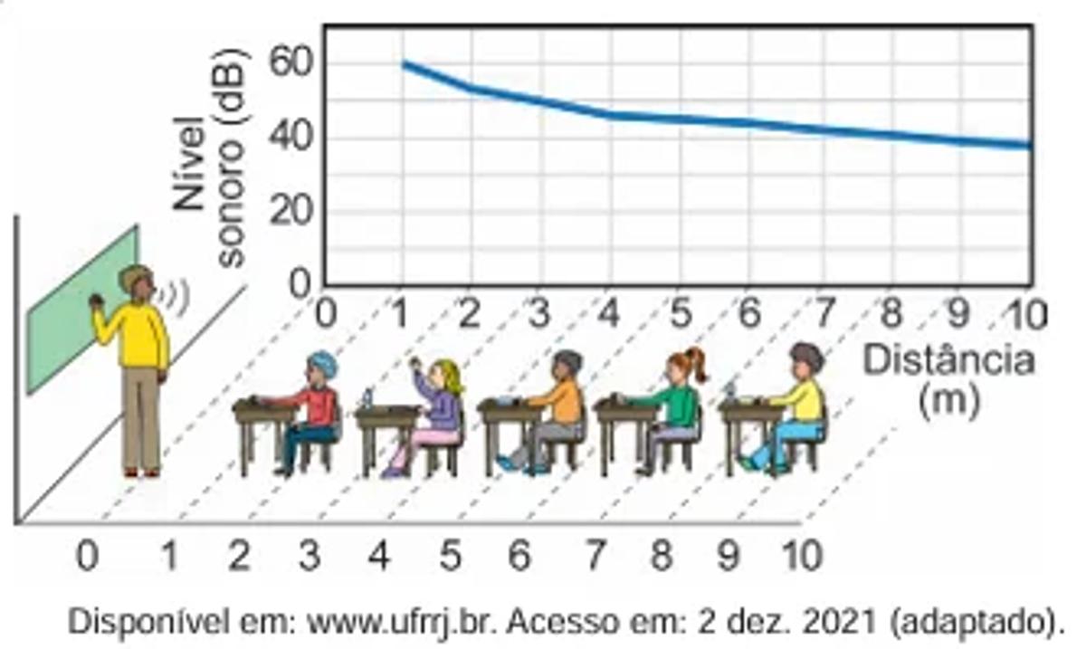 Dentre os parâmetros acústicos que afetam a inteligibilidade dos sons emitidos em ambientes fechados, destacam-se o ruído de fundo do ambiente e o decréscimo do nível sonoro com a distância da fonte emissora. Assim, sentar-se no fundo da sala de aula pode prejudicar a aprendizagem dos estudantes, por impedir que eles distingam, com precisão, os sons emitidos, diminuindo a inteligibilidade da fala de seus professores. Considere a situação exemplificada pelo infográfico: à distância de 1 metro, o nível sonoro da fala de um professor é de 60 dB e diminui com a distância. Considere, ainda, que o ruído de fundo nessa sala de aula pode chegar a 45 dB e que, para ser compreendida, o nível sonoro da fala do professor deve estar 5 dB acima desse ruído.