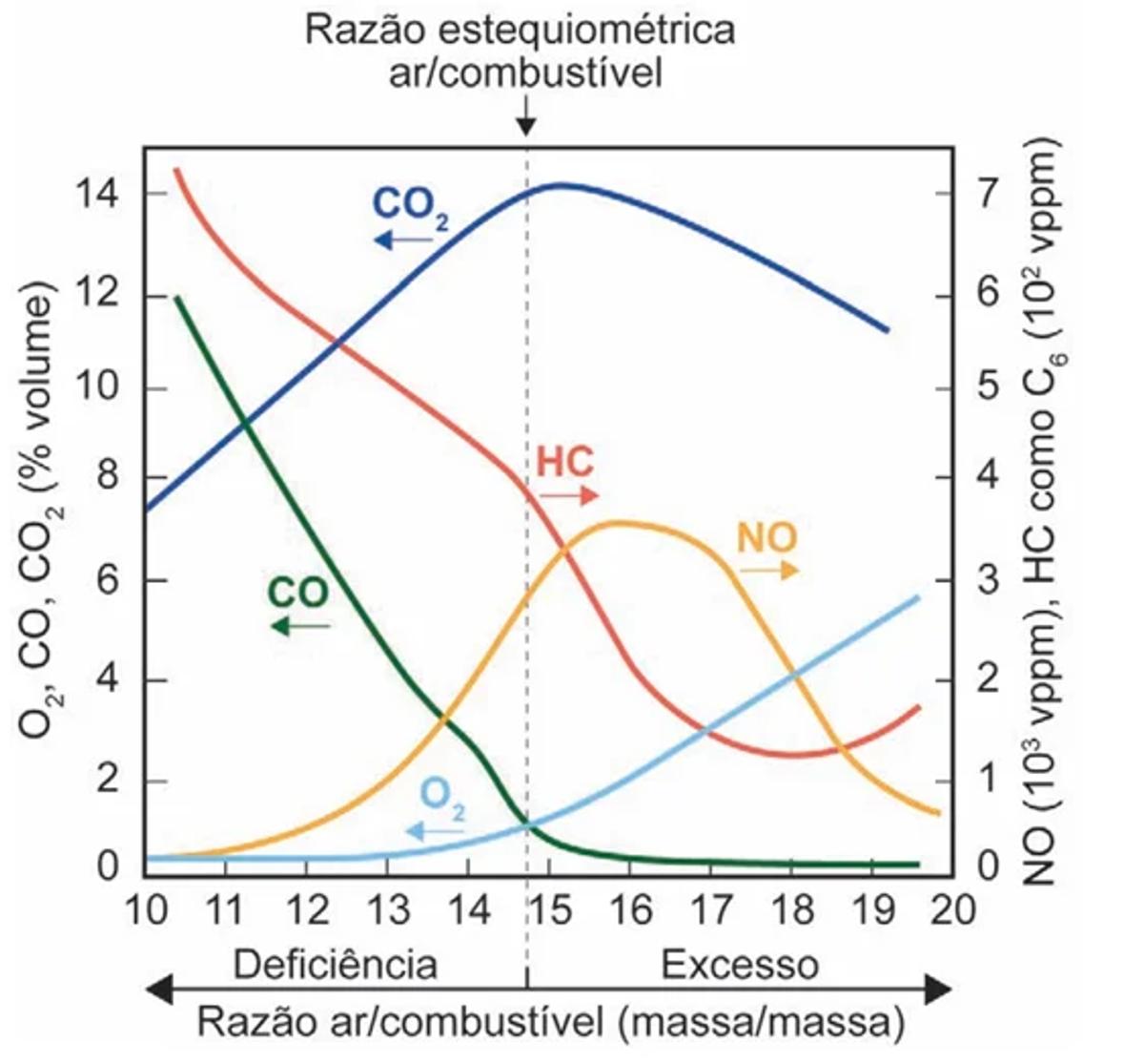 Um dos agentes que mais contribui para a poluição do ar é o automóvel a combustão interna. Em áreas urbanas, isso é demonstrado dramaticamente pela fumaça fotoquímica, resultante da interação entre óxidos de nitrogênio, hidrocarbonetos e luz solar, para formar produtos de oxidação, que causam irritação aos olhos, ao aparelho respiratório e danos às plantas. As condições de operação de motores a combustão, como a razão da mistura ar/combustível no cilindro, influenciam na composição dos gases lançados pelo escapamento na atmosfera. O gráfico ilustra a variação nas composições dos principais gases, dióxido de carbono (CO2), hidrocarbonetos (HC), monóxido de carbono (CO), monóxido de nitrogênio (NO) e oxigênio molecular (O2), emitidos por um motor a gasolina, em diferentes razões ar/combustível, em massa.
