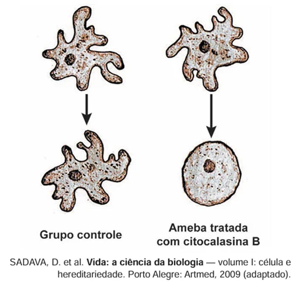 O esquema representa um experimento feito com células do protozoário Amoeba proteus. Nele, um grupo de células foi tratado com a droga citocalasina B, enquanto outro grupo não foi tratado, servindo como controle. O formato e o movimento das células tratadas foram comprometidos.