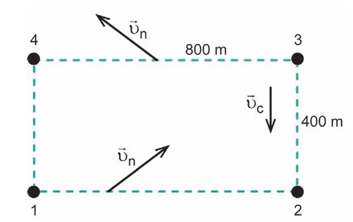 Para os circuitos de maratonas aquáticas realizadas em mares calmos e próximos à praia, é montado um sistema de boias que determinam o trajeto a ser seguido pelos nadadores. Uma das dificuldades desse tipo de circuito é compensar os efeitos da corrente marinha. O diagrama contém o circuito em que deve ser realizada uma volta no sentido anti-horário. As quatro boias estão numeradas de 1 a 4. Existe uma corrente marinha de velocidade cujo módulo é 30 metros por minuto, paralela à praia em toda a área do circuito. Nas arestas mais longas, o nadador Precisará nadar na direção apontada pelos vetores dos pontos 1 até 2 e de 3 até 4. Considere que a velocidade do nadador é de 50 metros por minuto, em relação à água, durante todo o circuito.