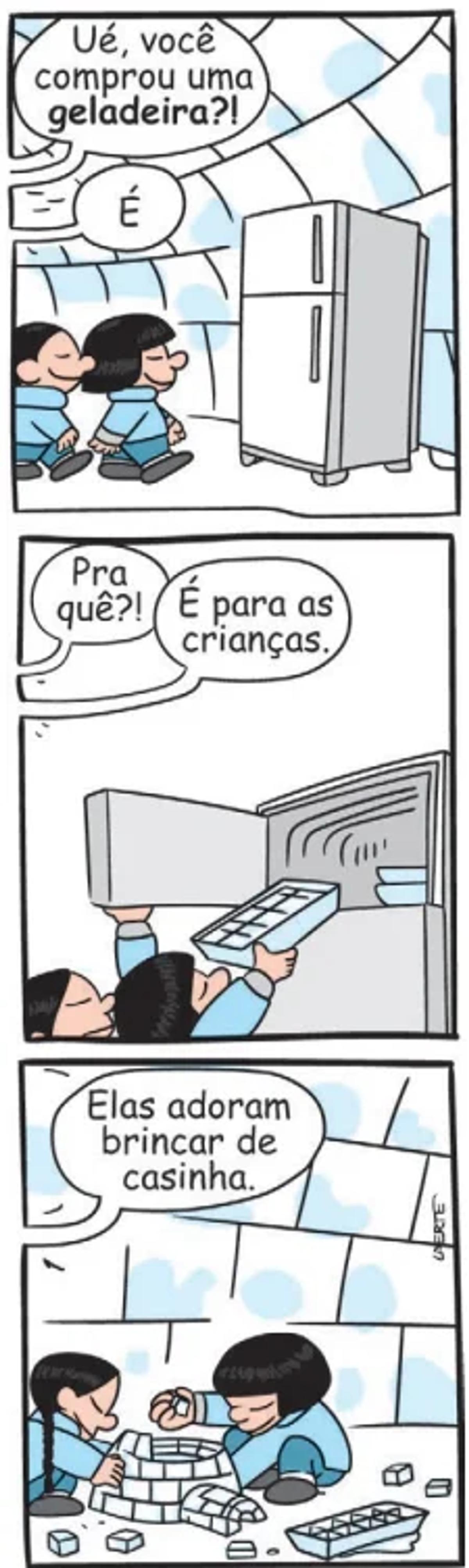 A tirinha ilustra esquimós dentro de um iglu, habitação de formato hemisférico construída durante o inverno a partir de neve ou blocos de gelo. Essa estrutura de construção se justifica pelo fato de esse povo habitar as regiões mais setentrionais da Groenlândia, Canadá e Alasca.